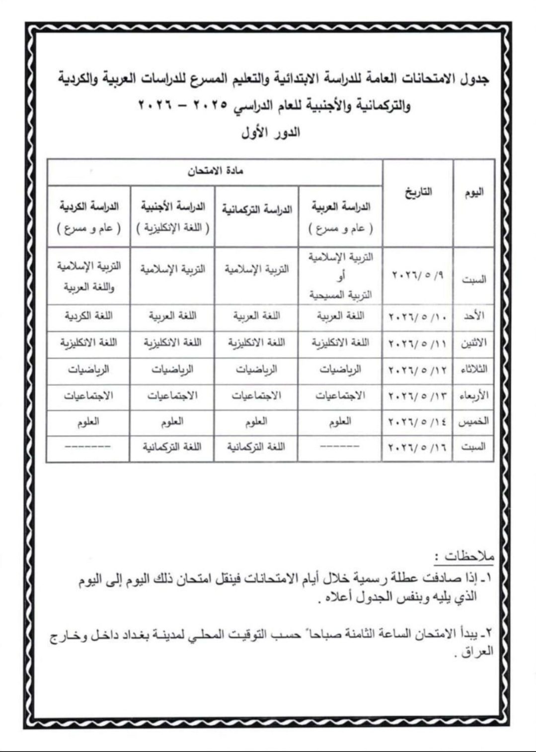 🔴 عاجل/ وزارة التربية تعلن جداول الامتحانات العامة للدراسة الابتدائية والمتوسطة للعام الدراسي (2025-2026) / الدور الاول مارس 24, 2026 | 👁️ 19 مشاهدة رئيس التحرير - زهور الزيادي 👁 19 مشاهدة 🔴 عاجل/ وزارة التربية تعلن جداول الامتحانات العامة للدراسة الابتدائية والمتوسطة للعام الدراسي (2025-2026) / الدور الأول للنظام المسرع والدراسة الاعتيادية وكالة صدى عراق الحقيقة 👍 0 👎 0 ❤️ 0 🔥 0